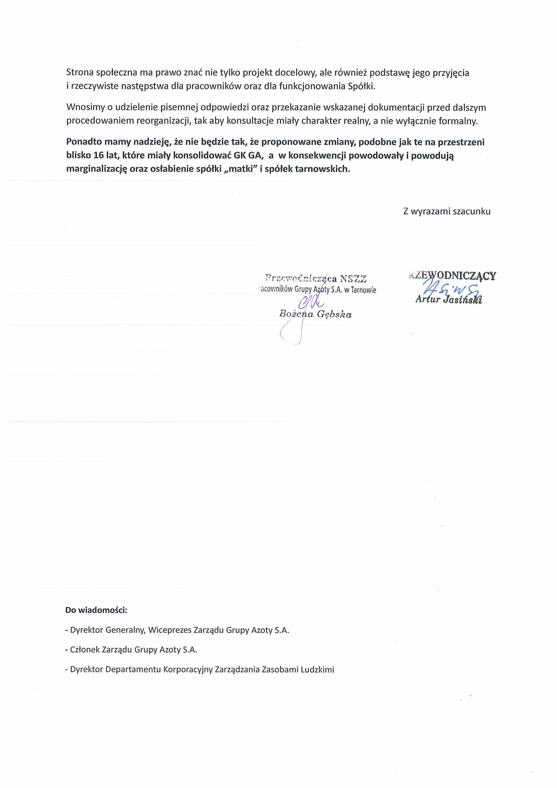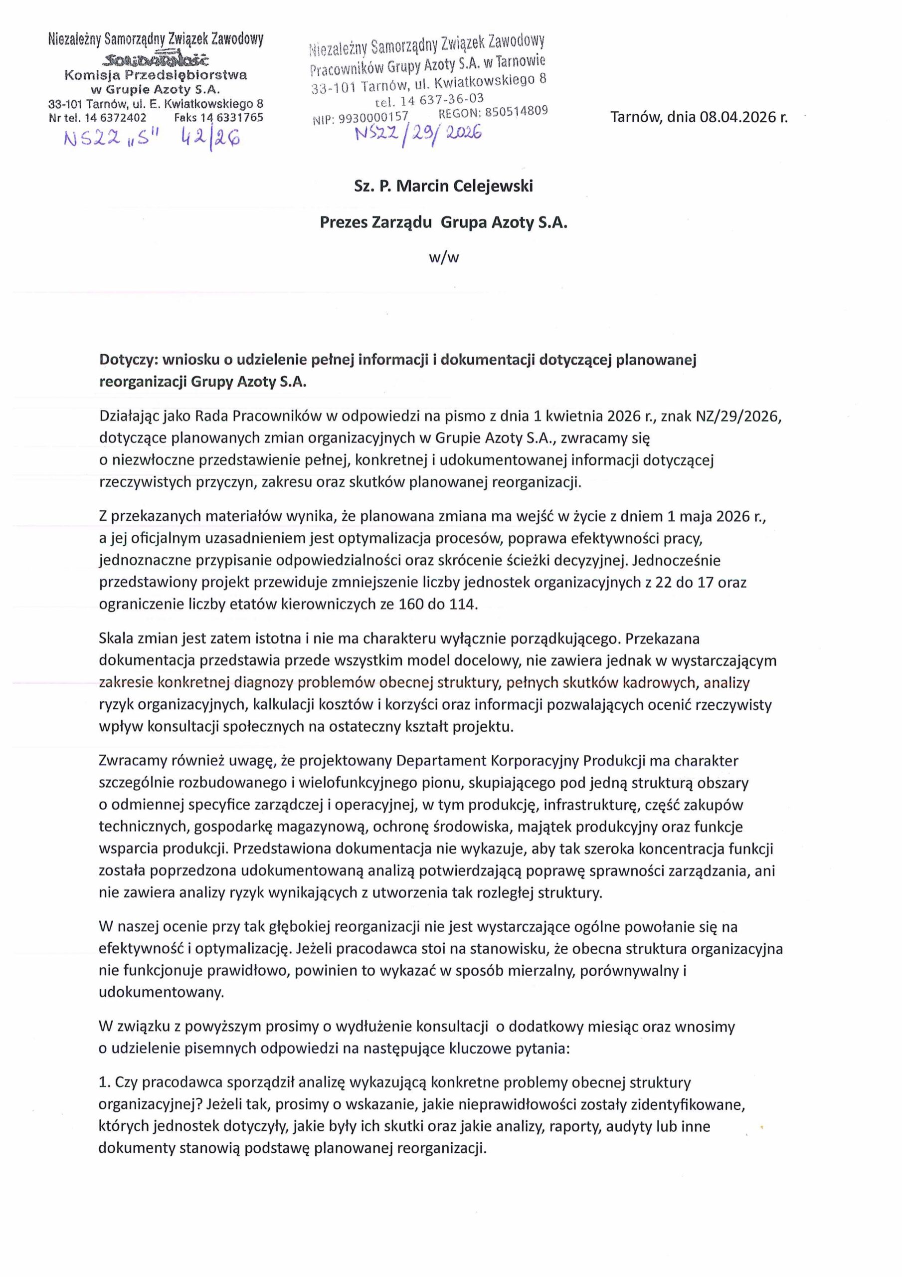 NSZZ Solidarność w Grupie Azoty S.A. pozostaje w gotowości do dalszego dialogu i oczekuje przekazania pełnych, wyczerpujących informacji, które umożliwią rzetelną ocenę proponowanych zmian.