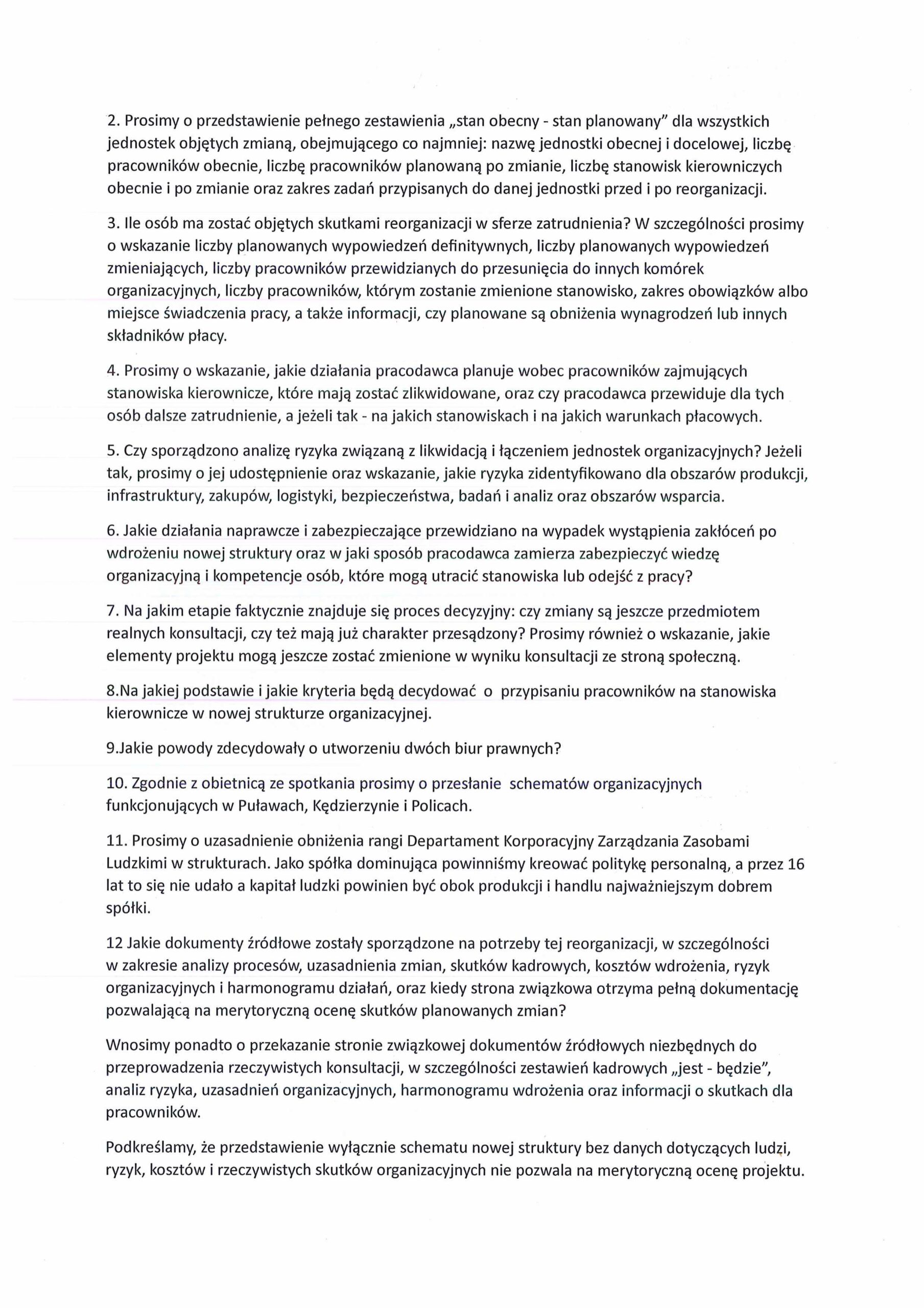 W związku z powyższym wystąpiliśmy do pracodawcy z prośbą o przesunięcie terminu wdrożenia nowej struktury. Podkreślamy, że zmiany te mają charakter kompleksowy i dotyczą funkcjonowania całego zakładu, co wymaga rzetelnego przygotowania oraz pełnej transparentności na etapie konsultacji.