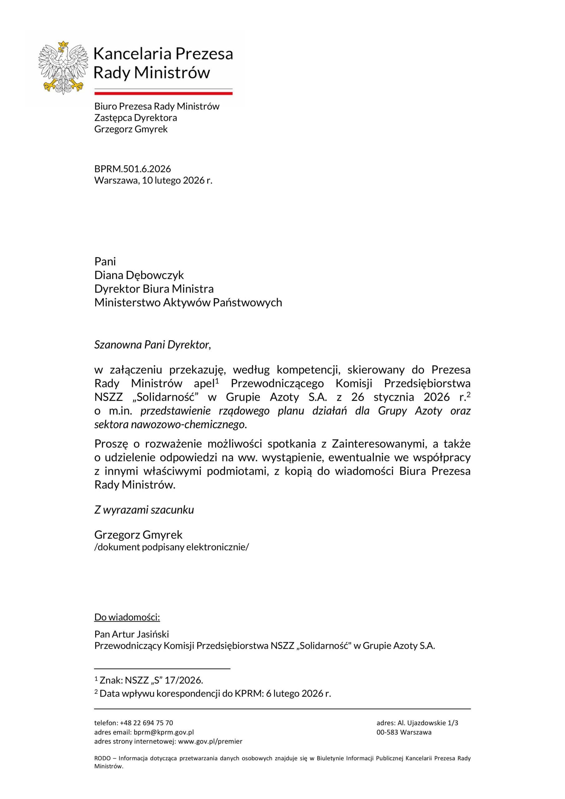 Informujemy, że w odpowiedzi na nasze wystąpienie dotyczące aktualnej sytuacji Grupy Azoty S.A., otrzymaliśmy pismo z Kancelaria Prezesa Rady Ministrów, podpisane z upoważnienia Prezesa Rady Ministrów Donald Tusk.