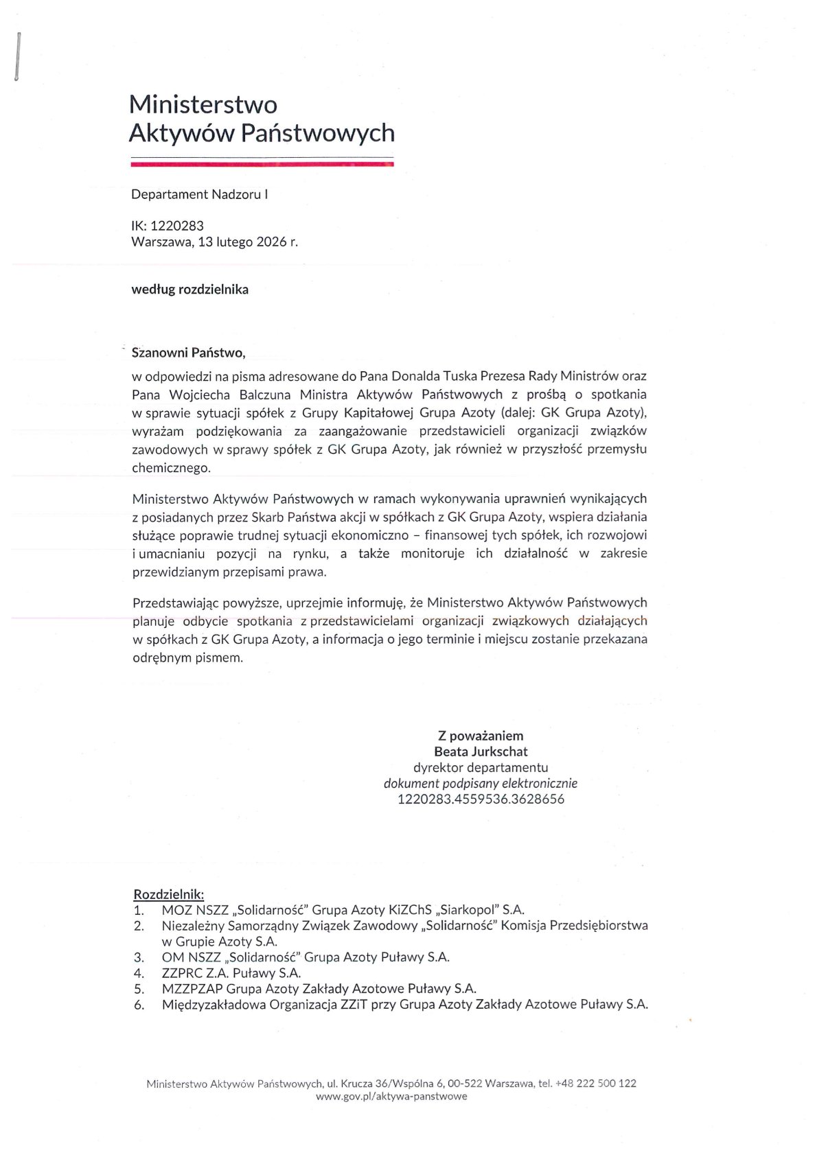 W odpowiedzi z Ministerstwa Aktywów Państwowych otrzymaliśmy informację, że w związku z naszym wystąpieniem zostanie zorganizowane przez MAP spotkanie ze stroną społeczną. Podczas tego spotkania ma zostać omówiona aktualna sytuacja Grupy Azoty oraz możliwe kierunki dalszych działań.